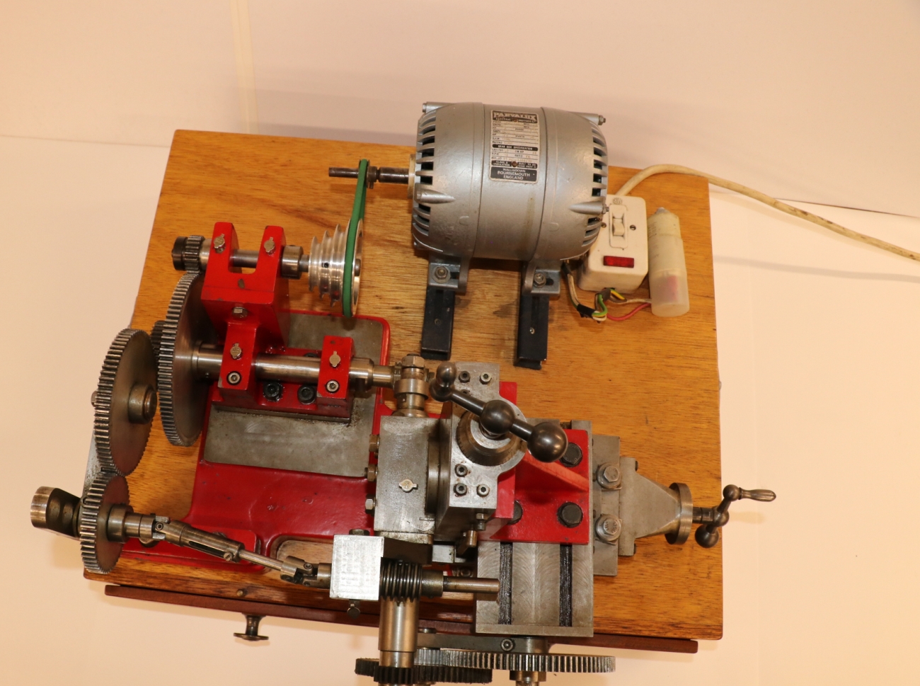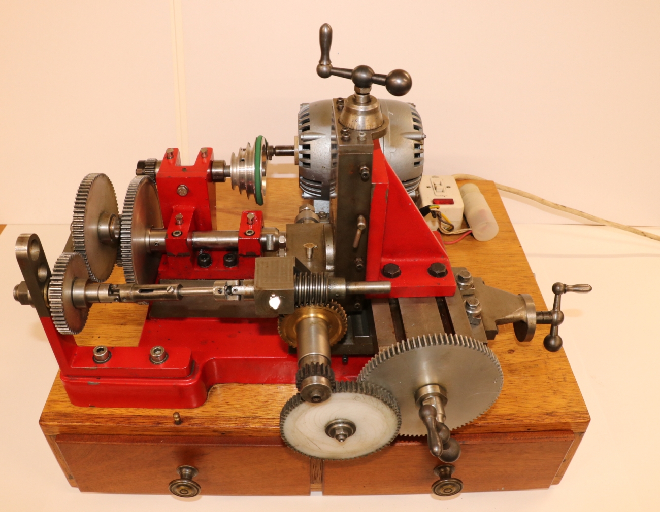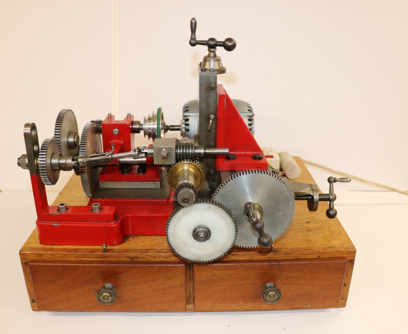 Bench-top gear hobbing machine produced from the College Engineering castings kit. Very handy, very well made in full working order. From the very little history that I have, I believe it was a prize-winning machine. Mounted on a stout base with two drawers containing hobs, changewheels, adapters and other accessories. The Parvalux motor is running smoothly and quietly, and has a new belt. I have had the machine running, and all the bearings and ways are as they should be. The electrical wiring is apparently OK, but this is not my area of expertise, so a thorough check is advised. £1100 or best offer