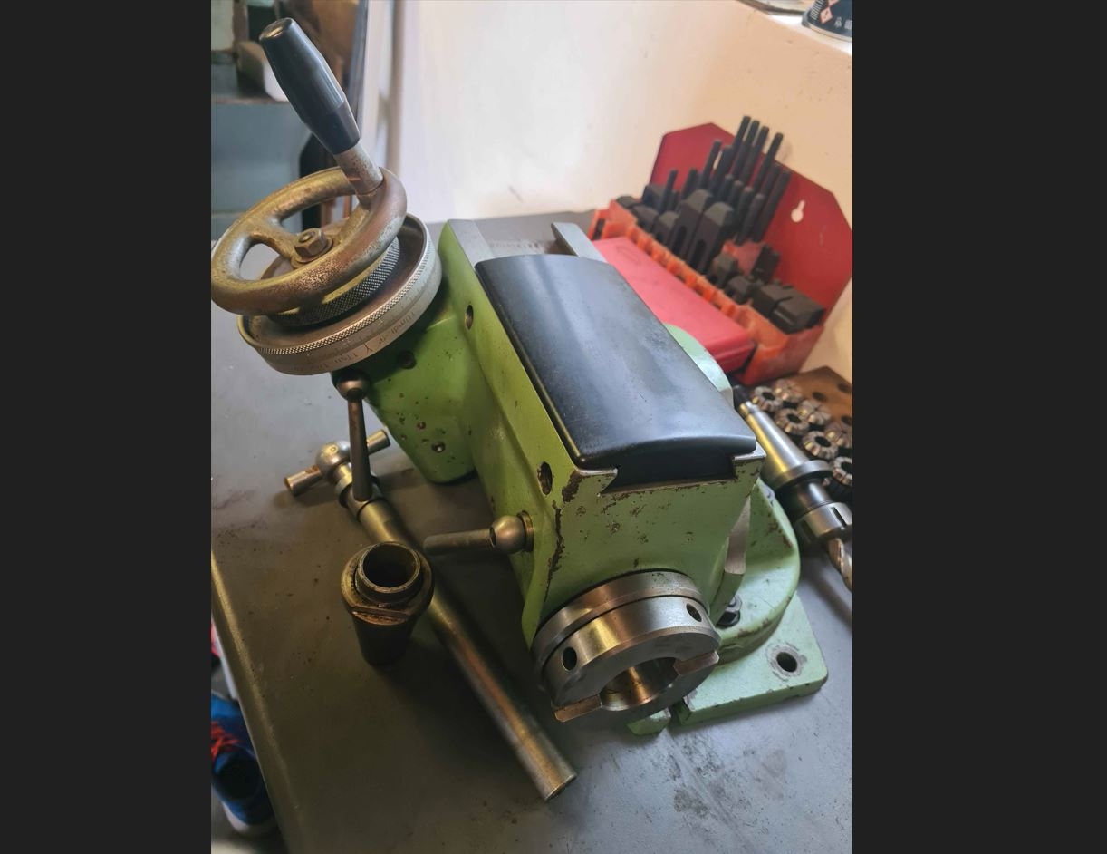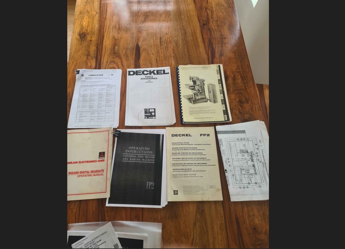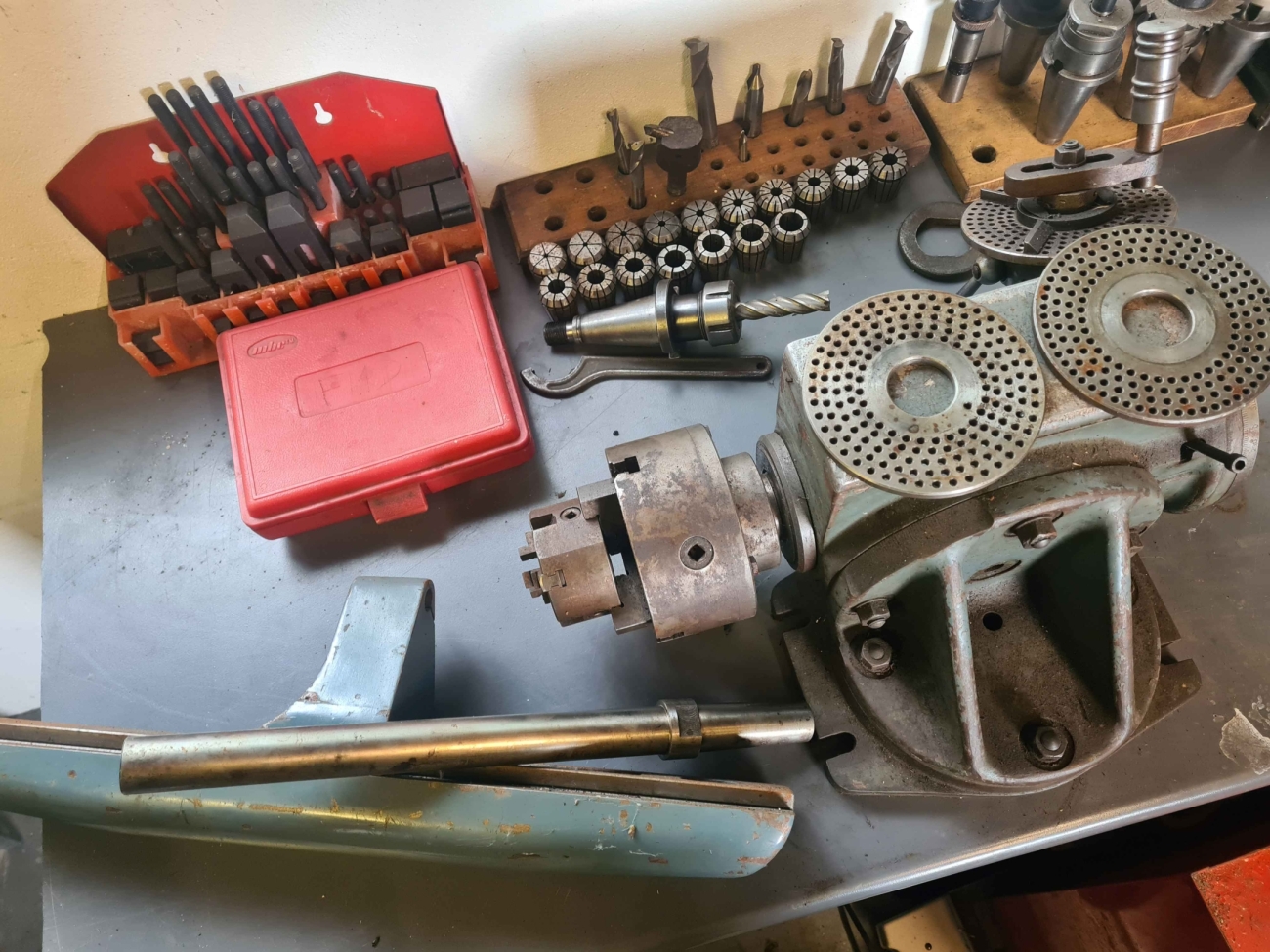 Qty 2 Deckel dividing heads, 1 FVT2 type with standard SK40 bore, drawbar that takes the standard collets and alignment arbor. The other is a Morse taper 4 type and has an overarm attachment for steadying long jobs, an alignment arbor, two chucks and additional index plates. Good quality rotary table made by Allen, 24 Deckel collets and adapter, ER32 collet chuck with Qty 18 collet set, Clarkson Autolock collet chuck, Drill chuck, carbide face mill, slitting saw holder, Morse taper adapter, large selection of end mills and slot drills, tee slot and dovetail cutters. Clamp and riser block set and 10 sets of parallels. Set of Deckel manuals, including operating manual, maintenance and lubrication, spare parts listing with exploded diagrams, and Anilam Digital readout manual, including configuration and adjustment instructions. Details of Deckel FP2 millers here https://www.lathes.co.uk/deckel/page4.html