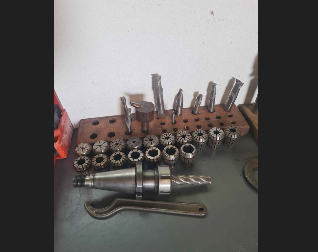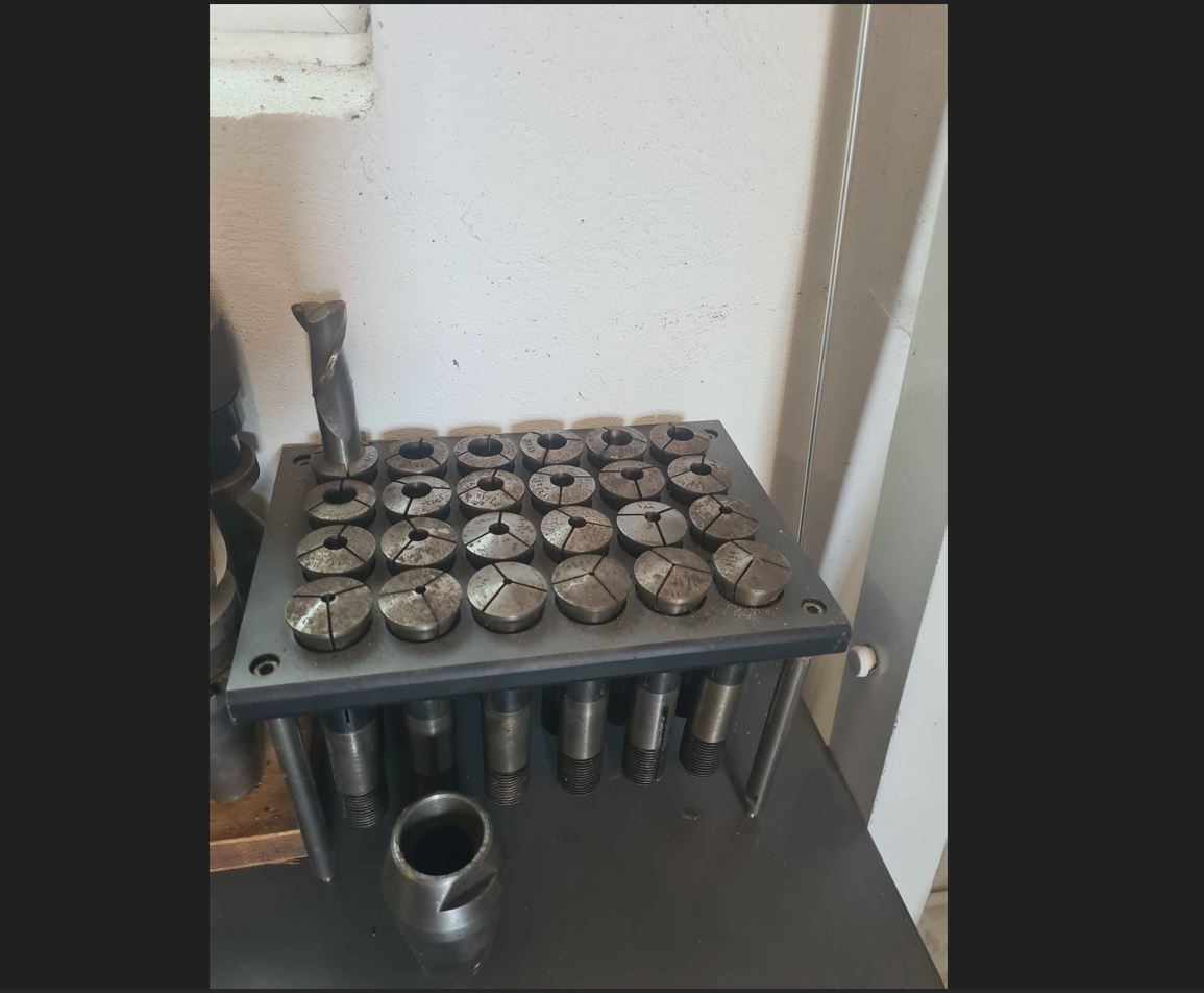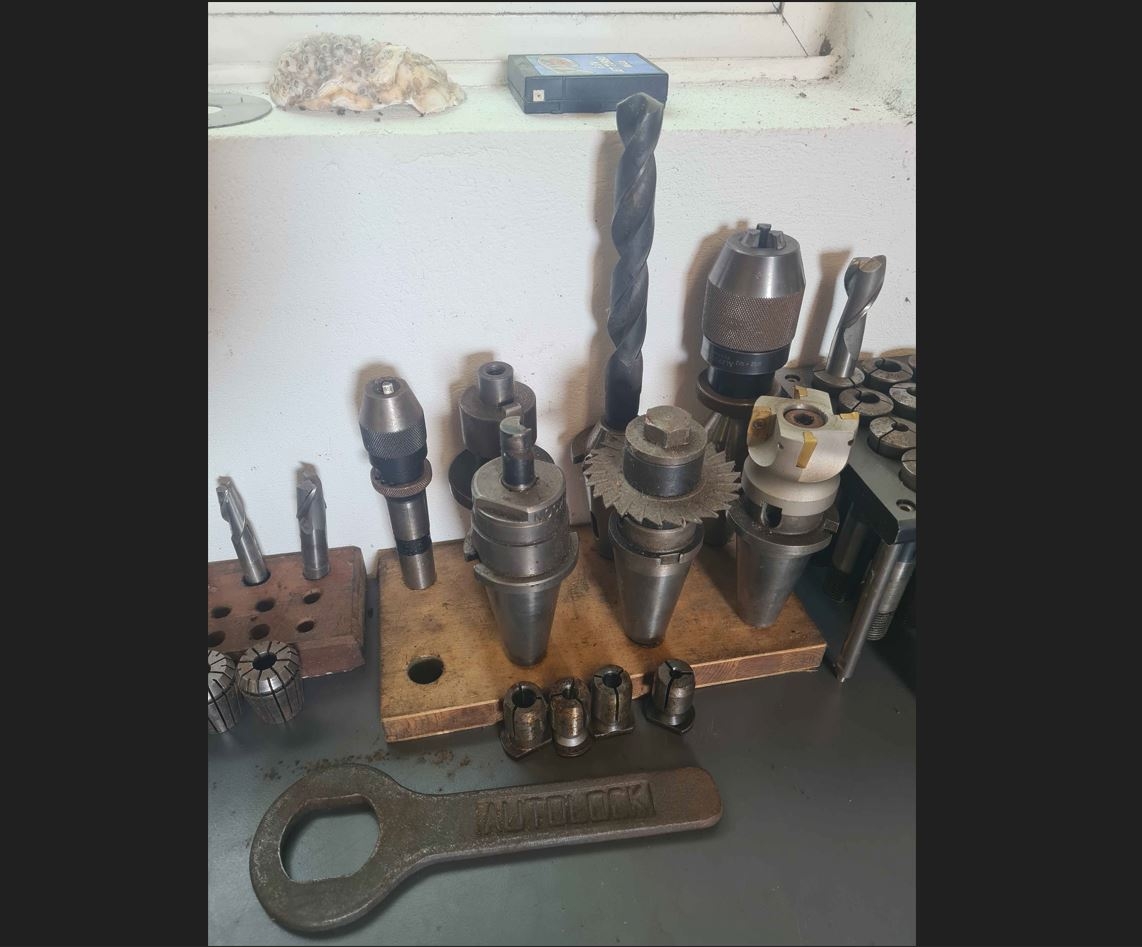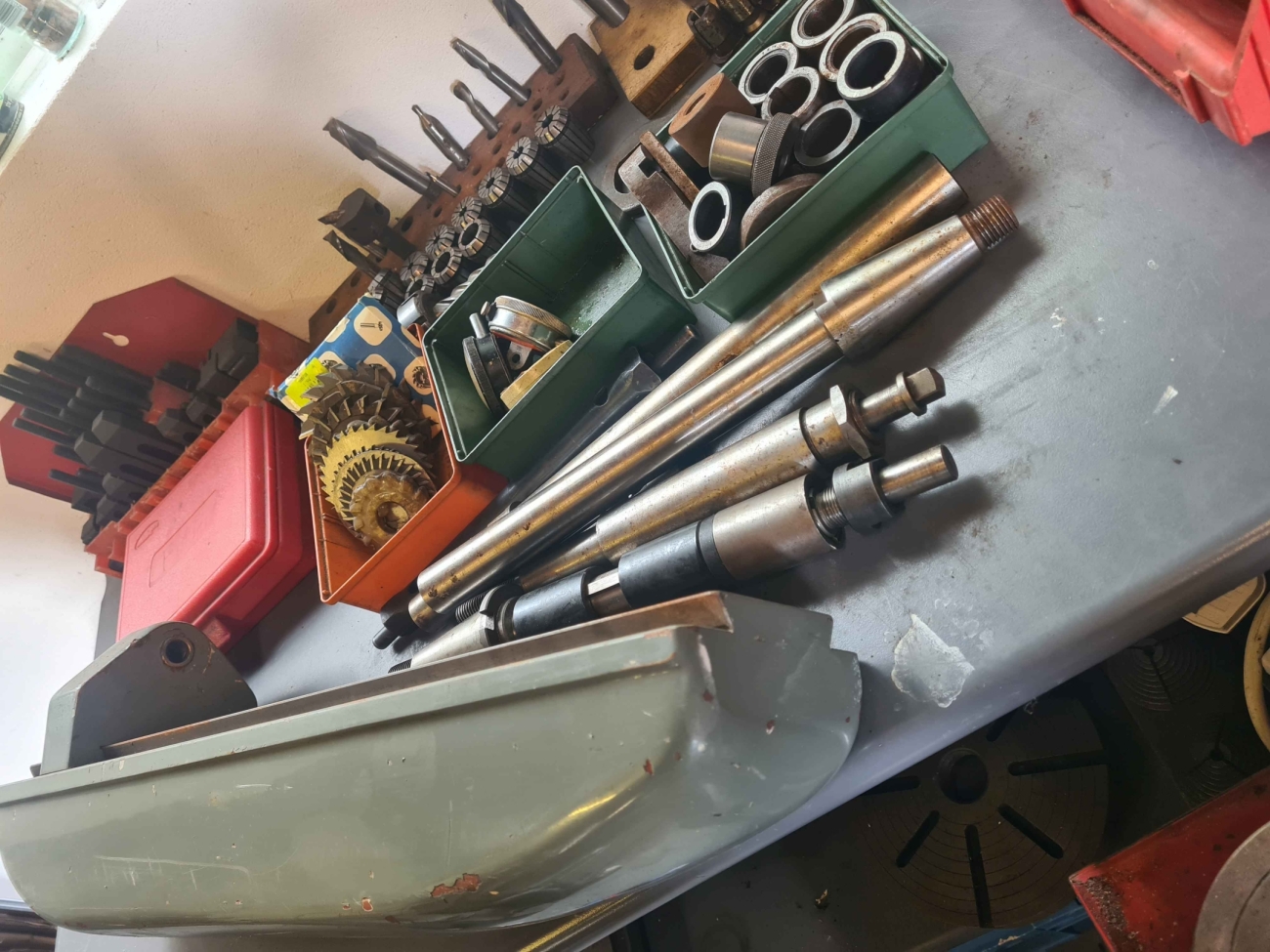 Qty 2 Deckel dividing heads, 1 FVT2 type with standard SK40 bore, drawbar that takes the standard collets and alignment arbor. The other is a Morse taper 4 type and has an overarm attachment for steadying long jobs, an alignment arbor, two chucks and additional index plates. Good quality rotary table made by Allen, 24 Deckel collets and adapter, ER32 collet chuck with Qty 18 collet set, Clarkson Autolock collet chuck, Drill chuck, carbide face mill, slitting saw holder, Morse taper adapter, large selection of end mills and slot drills, tee slot and dovetail cutters. Clamp and riser block set and 10 sets of parallels. Set of Deckel manuals, including operating manual, maintenance and lubrication, spare parts listing with exploded diagrams, and Anilam Digital readout manual, including configuration and adjustment instructions. Details of Deckel FP2 millers here https://www.lathes.co.uk/deckel/page4.html