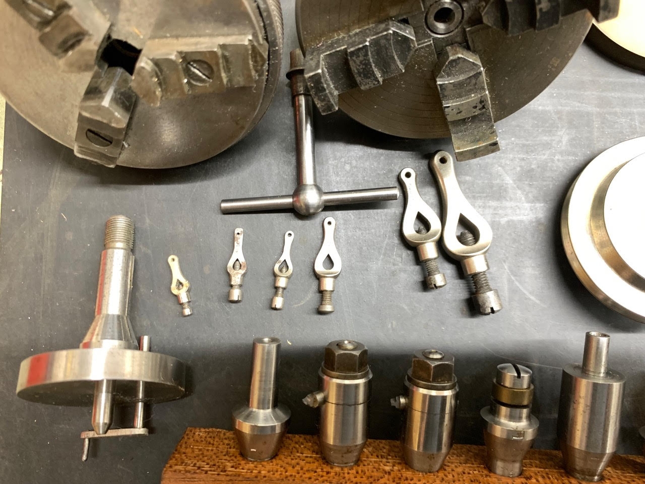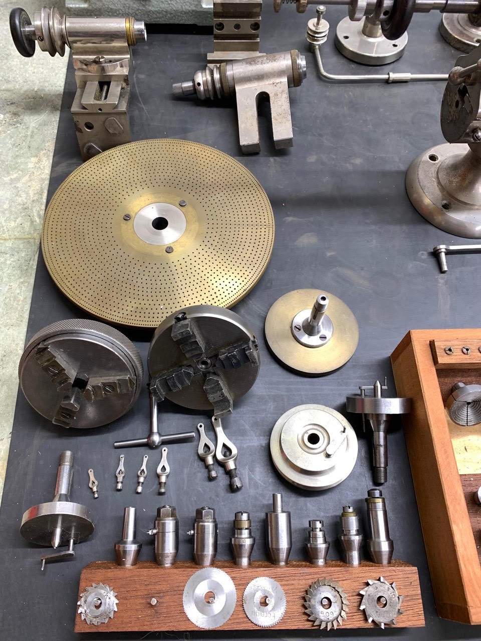 This is an opportunity to purchase a bit of history, for the lathe was in the long-term ownership of George H Thomas, one of the most famous names in Model Engineering. A picture of it from one of his books is reproduced below. Overall, the lathe and accessories are in excellent condition, although as can be seen in the photographs, there is some loss of plating on the bed, the overhead pulley apparatus and a couple of the accessories. Mechanically, everything is in excellent order. This is an extremely comprehensive set-up - almost all the accessories made for this lathe are included along with a few items George Thomas made himself. Please see photos for everything that’s in the offer, but highlights include:
