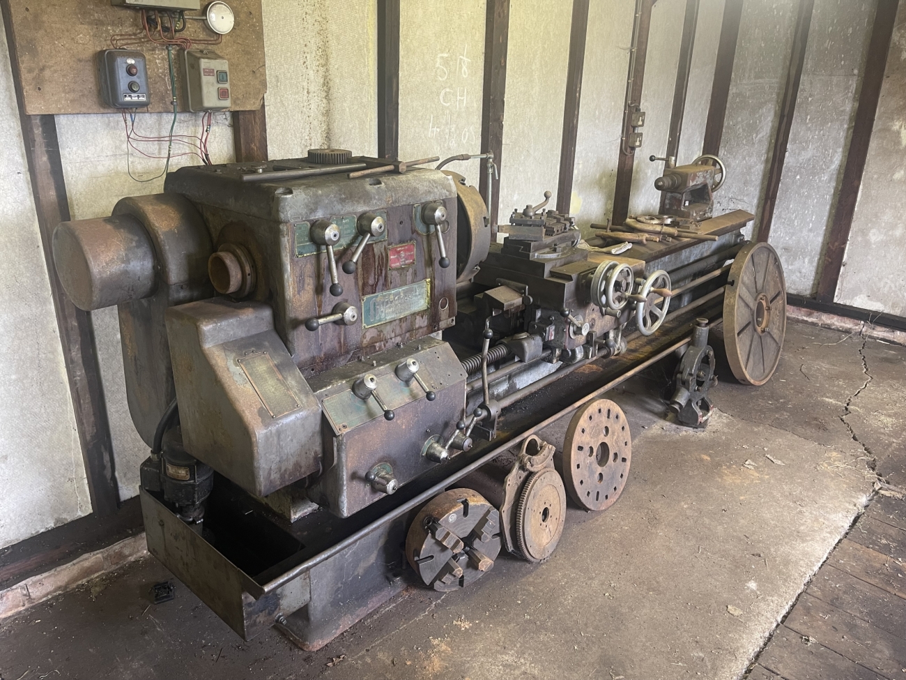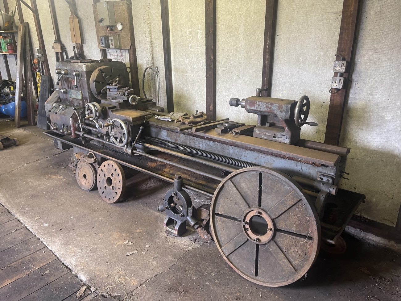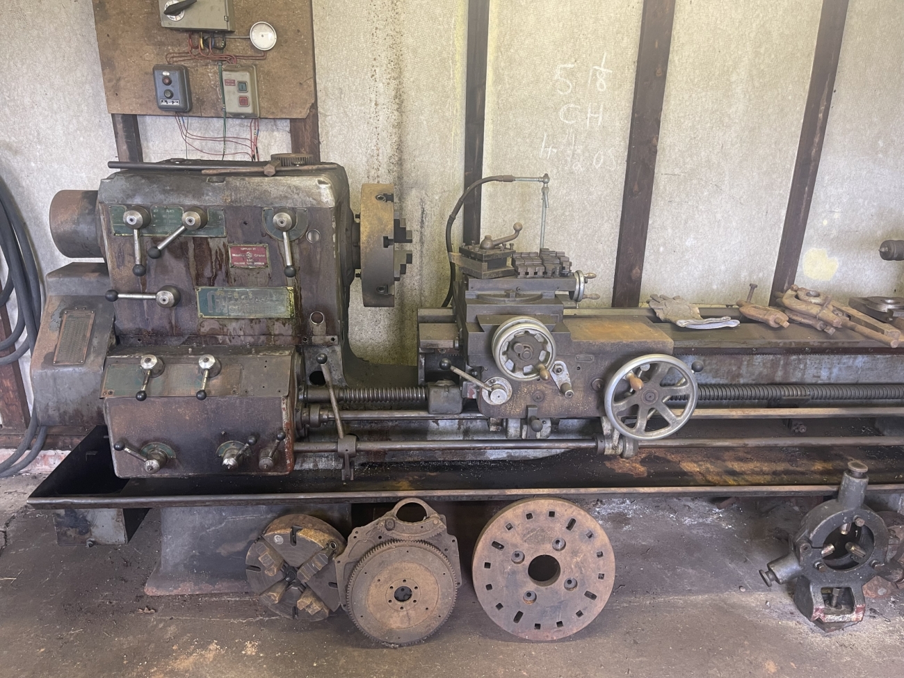 I have inherited this lathe and so I don't know much about it, but I believe it is an OM or NM model it's 3m in length and I can provide more details/photos as needed. However, it is equipped with a 3-jaw chuck 4-jaw independent chuck, a fixed steady, 4-way toolpost, one very large and one smaller faceplate, and a tailstock rotating centre. I’ve switched it on, and it does work. Offers invited.