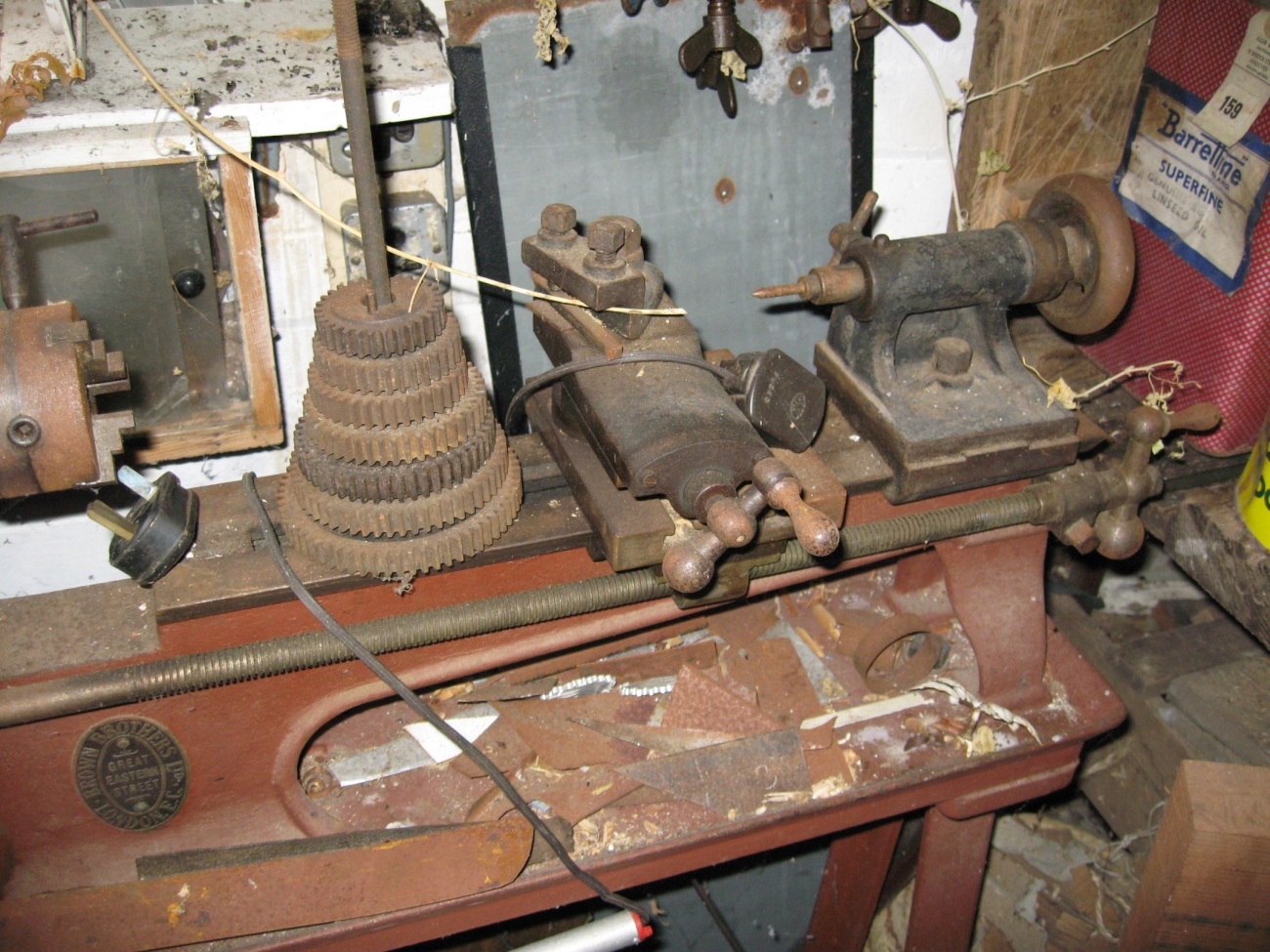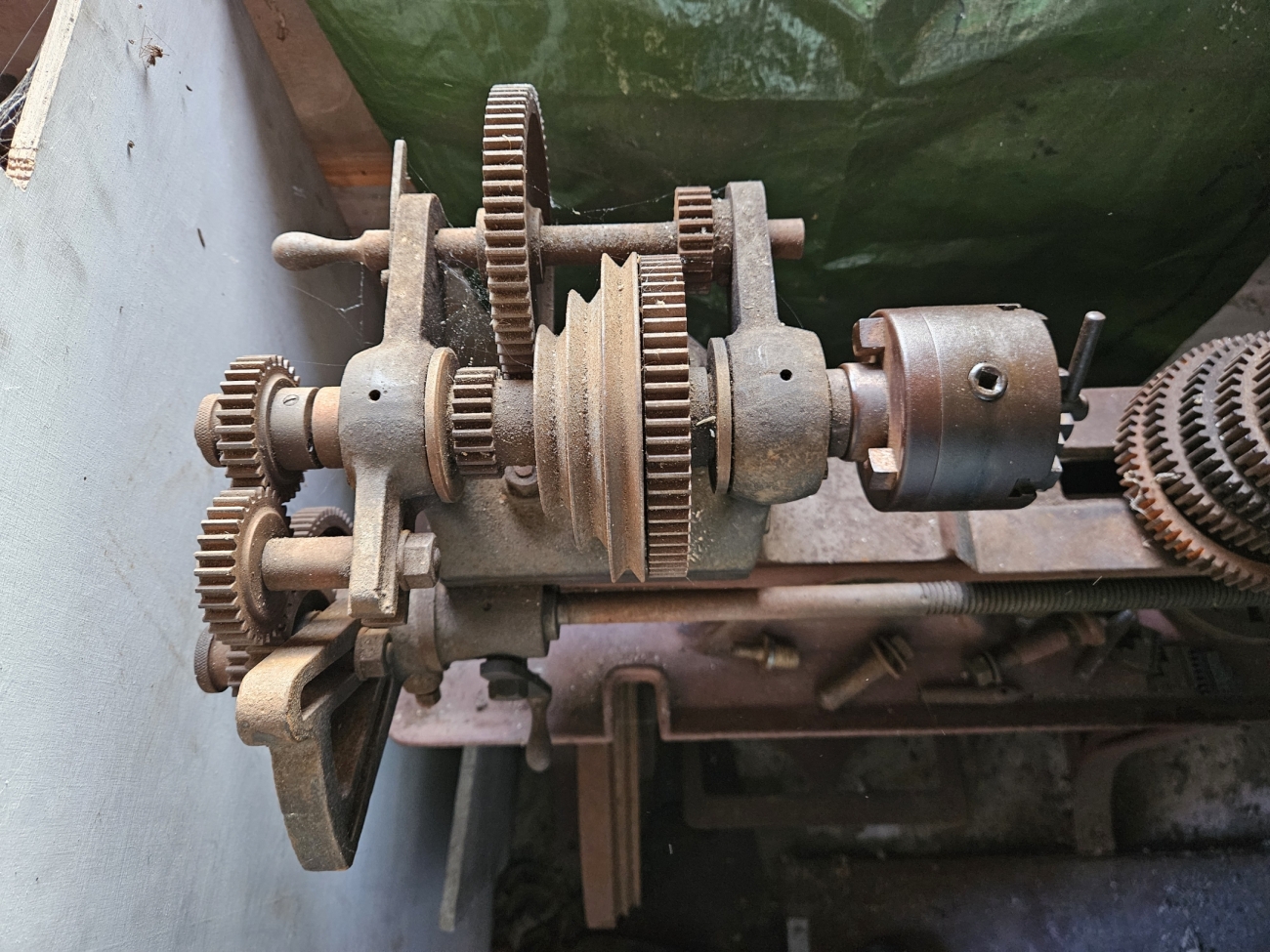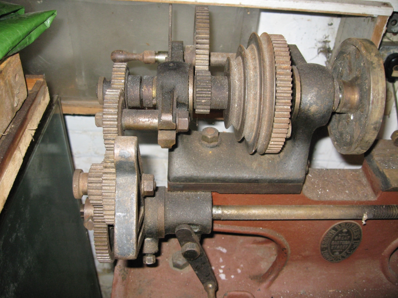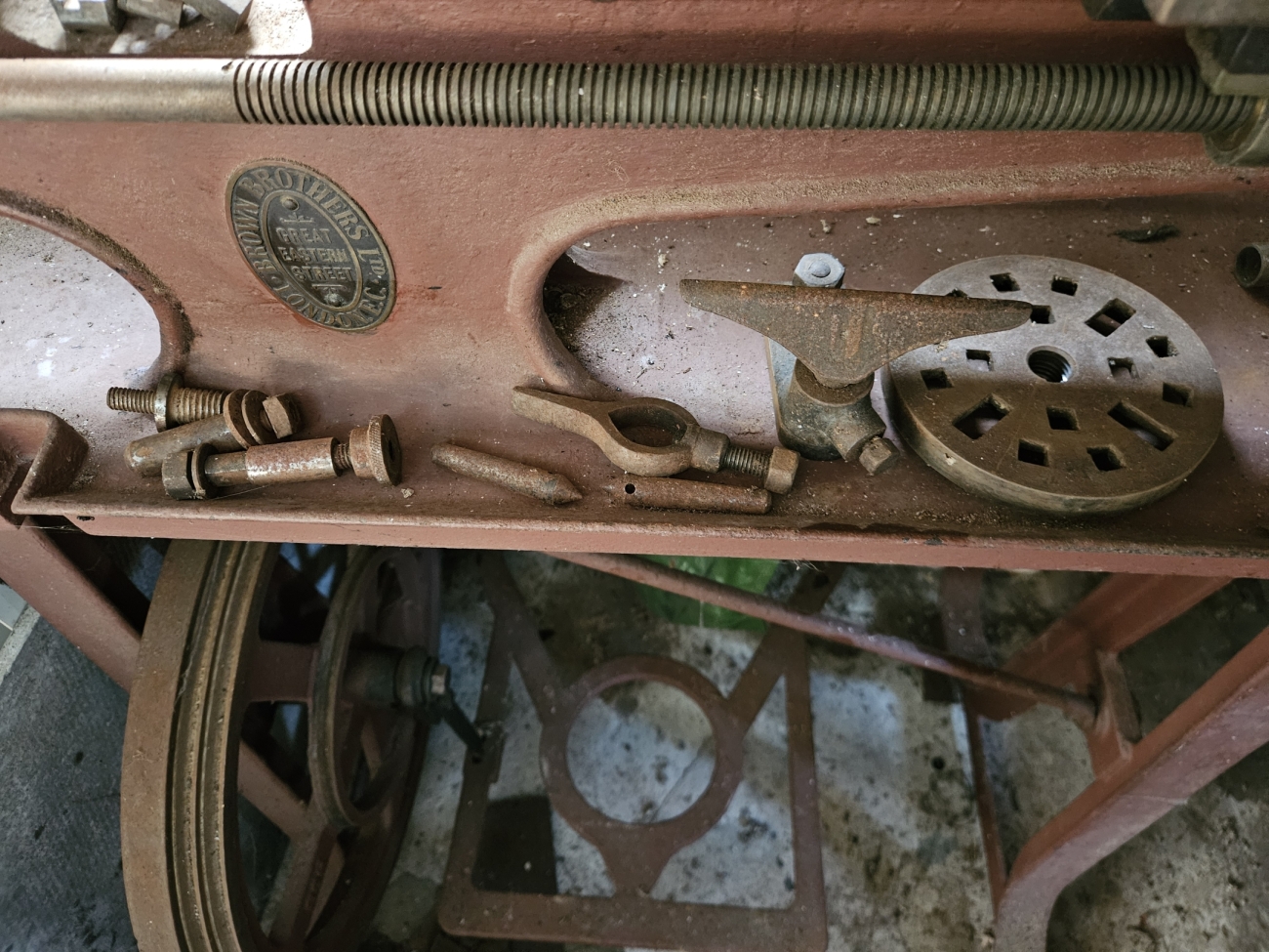 Brown Brothers backgeared and screwcutting treadle lathe, mounted on the maker’s treadle stand and very similar to the contemporary Drummond 3.5” model. The lathe may well have been the first venture by Colchester. See: https://lathes.co.uk/colchester1909/