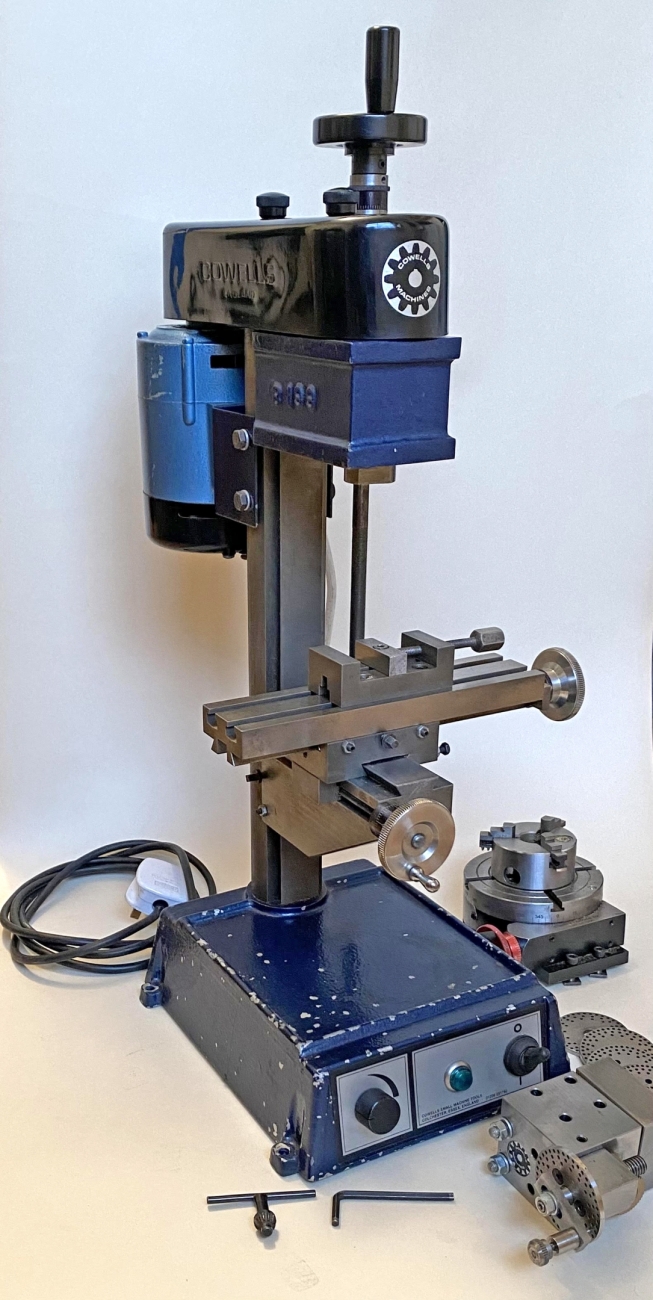 Cowells precision vertical milling machine. One professional clock-making owner from new and in perfect working order. Complete with a Cowells Dividing unit and five division plates, a rotary table by Sherline with a high-quality Bison three-jaw chuck and a collection of high-quality end mills. The table is 203mm x 50mm (8" x 2″) with a longitudinal Travel of 150mm ( 6″0, a cross feed of 80mm (3.1″) and vertical head travel of 165mm (6.5"). Drive is from the original high-quality 220/240v Parvalux D.C. 4000 r.p.m. motor continuously rated at 125-watt output with spindle speeds continuously variable between 40 and 4000 r.p.m. Drive to the spindle is through toothed belts to give a non-slip drive. The switchgear is built-in with a green neon warning lamp, and the control potentiometer with anodised aluminium control knob.